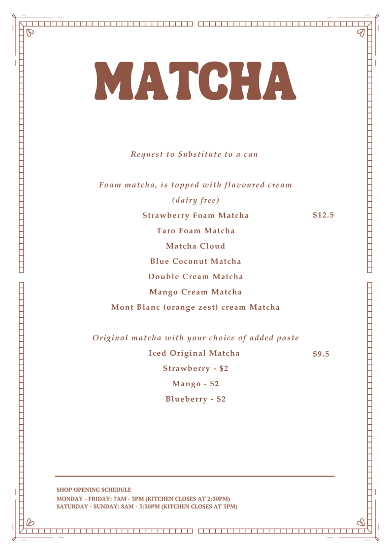 When it comes to the menu, Yield Cafe is a feast for the senses. Start your day with the invigorating aroma of expertly brewed coffee, with options like the robust Espresso ($5.50) or the smooth Flat White ($6.50). For a refreshingly different experience, indulge in their signature canned matchas, which feature unique flavors such as Strawberry and Mango—both favorites amongst patrons.
