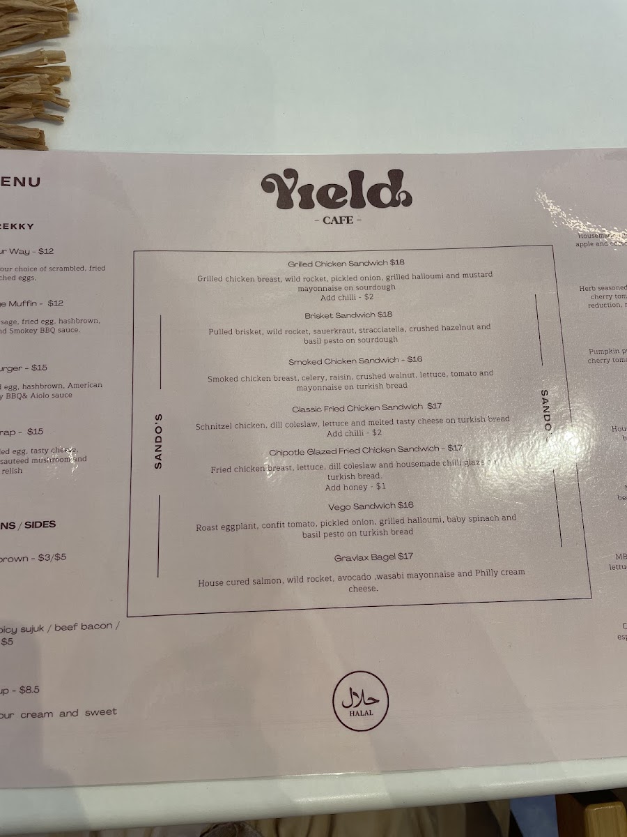 The café’s food menu is equally enticing, featuring dishes like the Smoked Chicken Focaccia, generously loaded with toasted walnuts and herbs at just A$23.00, or their satisfying Glazed Fried Chicken Shokupan Sando ($27.00), perfect for those who crave a bit of Southern comfort. Each bite exudes flavor, reflecting the culinary care and attention to detail that Yield Cafe prides itself on.